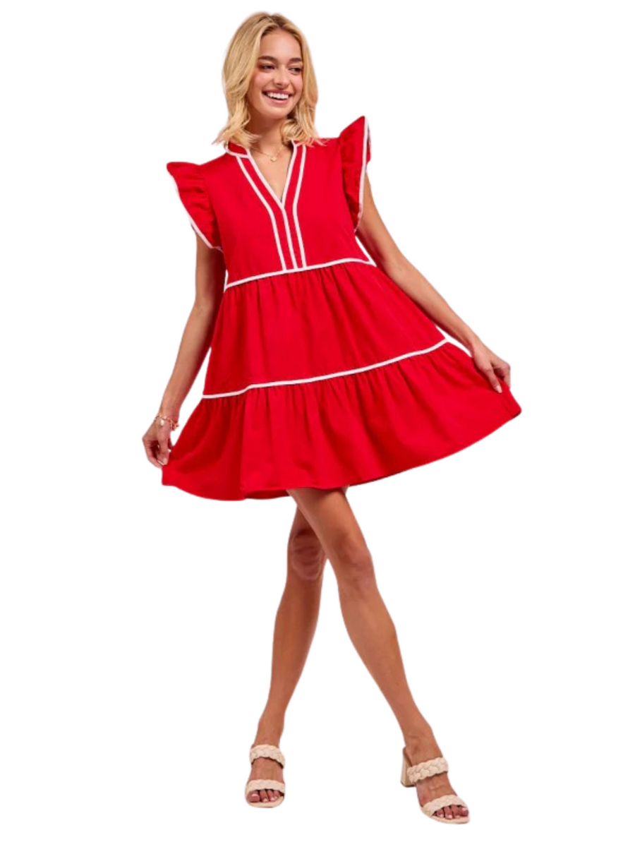 CONTRAST BINDING MINI DRESS-RED/WHITE