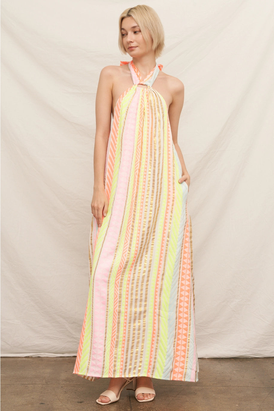 NEON LUREX HALTER NECK MAXI DRESS-PINK NEON