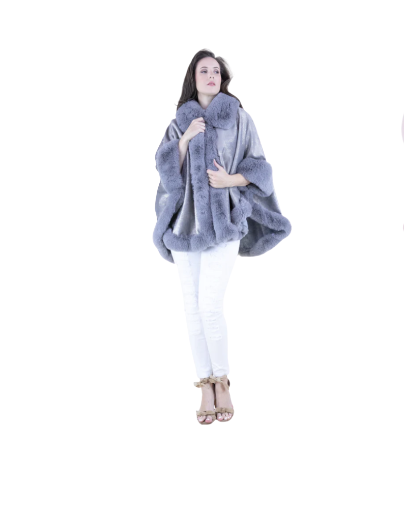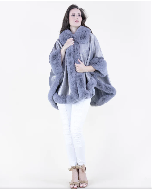 LUSTER FAUX FUR TRIMMED SUEDE CAPE-GRAY