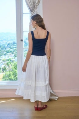 MIXED MEDIA MIDI DRESS-NAVY