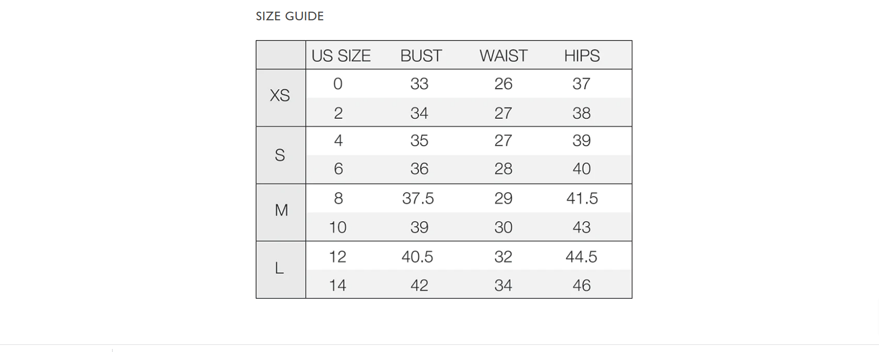 - Bust: Extra Small 35", Small 36", Medium 37", Large 39"