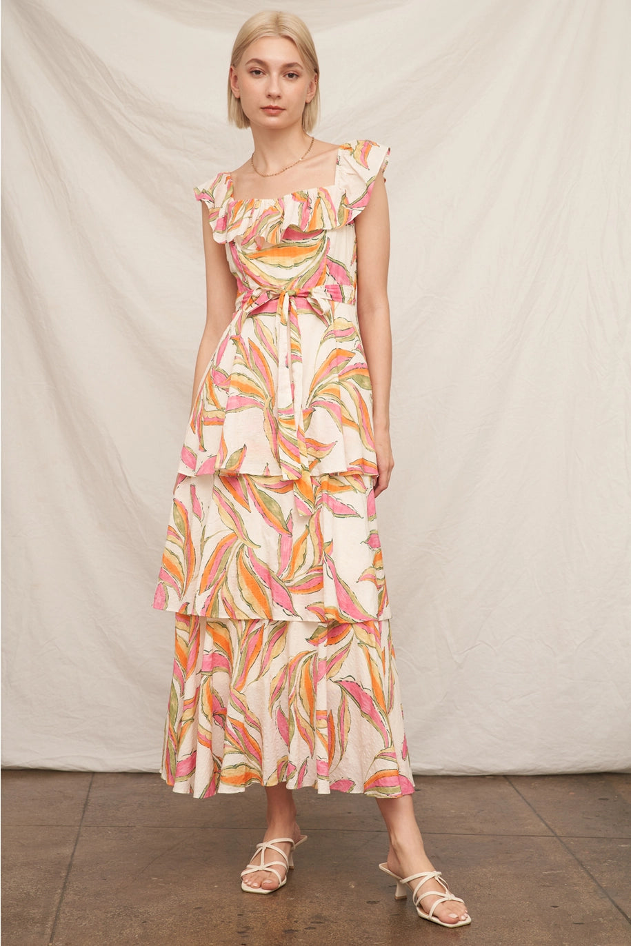 RUFFLED SLEEVE MAXI DRESS-RED/MULTI