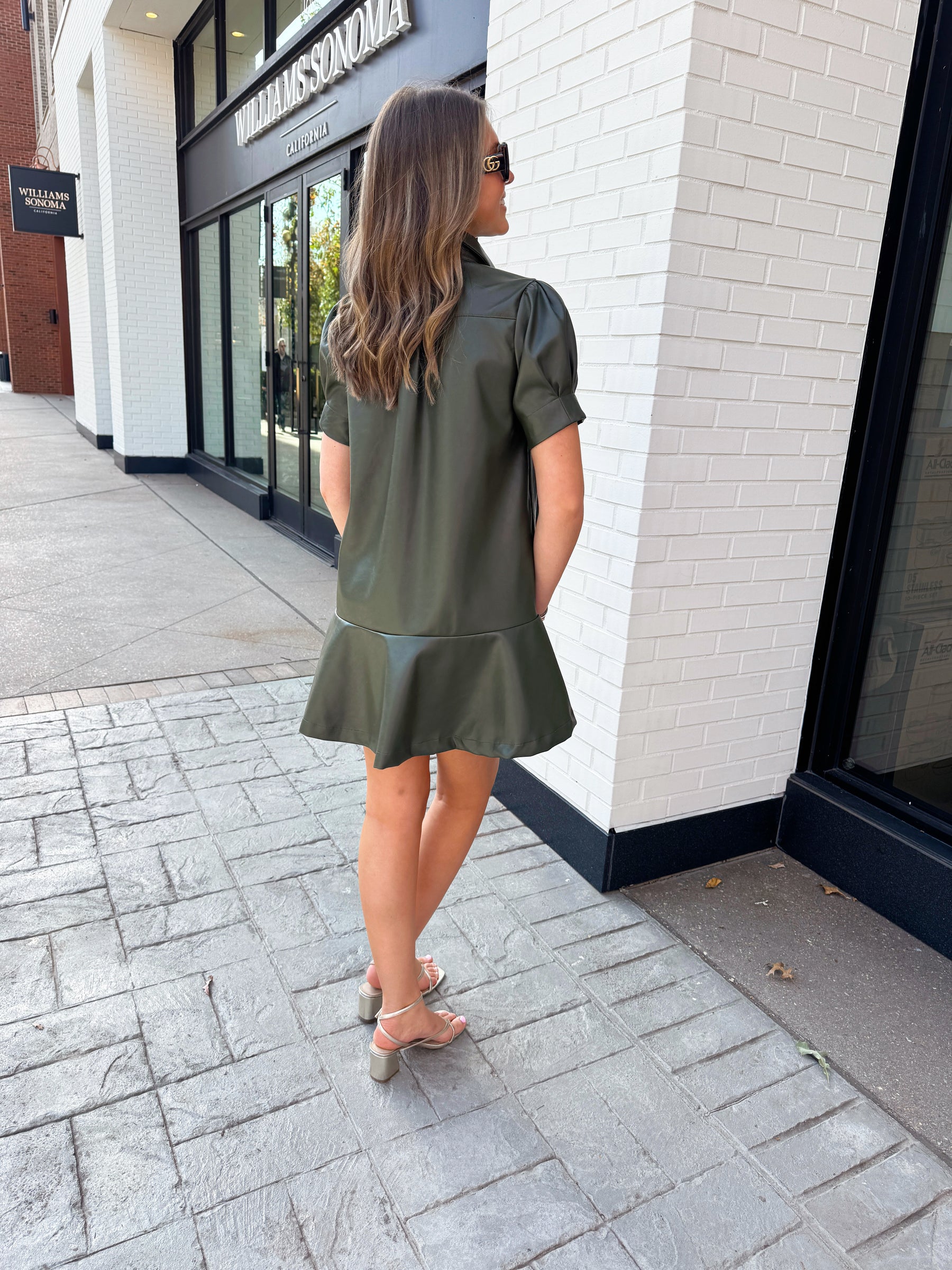 Fate Olive Puff Sleeve Faux Leather Mini Dress