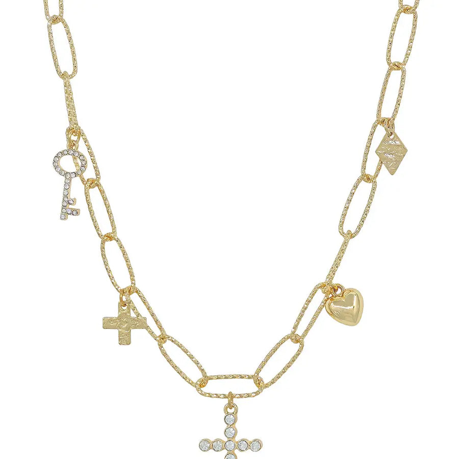 RHINESTONE CROSS CHARM CHAIN NECKLACE-GOLD