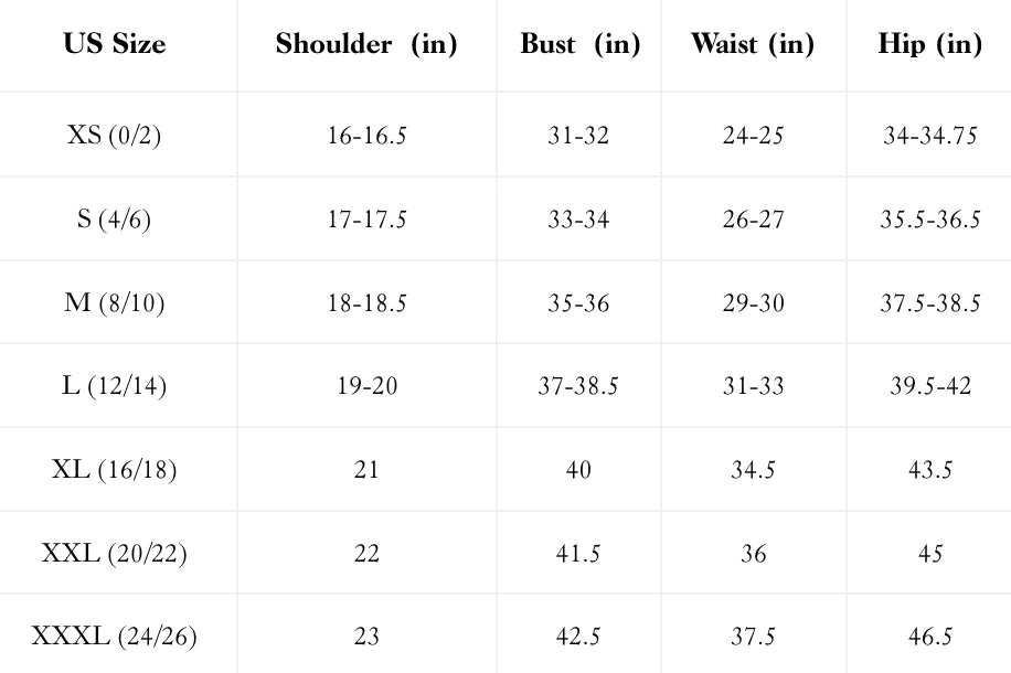 • Bust: Extra Small 32", Small 34", Medium 35", Large 37"