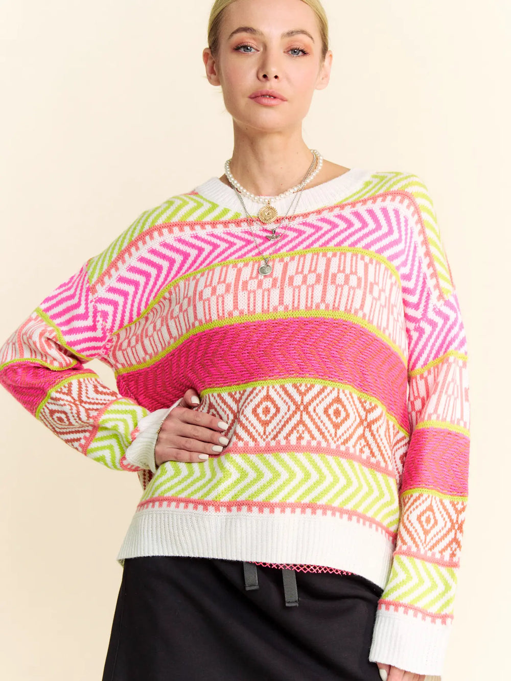MIX PATTERN TEXTURED SWEATER TOP-NEON PINK/MULTI