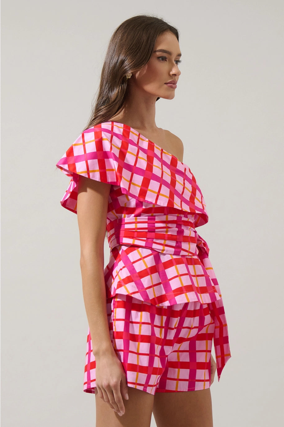 DARVY CHECKER ONE SHOULDER TOP-PINK/ORANGE